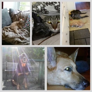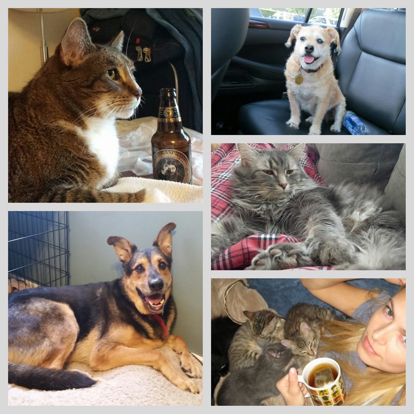 Past, Present, and adopted animals.  Bottom left: Circe, my angel, may she rest in Peace.  Bottom right, Dexy—the 11 year old Shepherd dumped at East Valley that lived her last year in happiness with me.